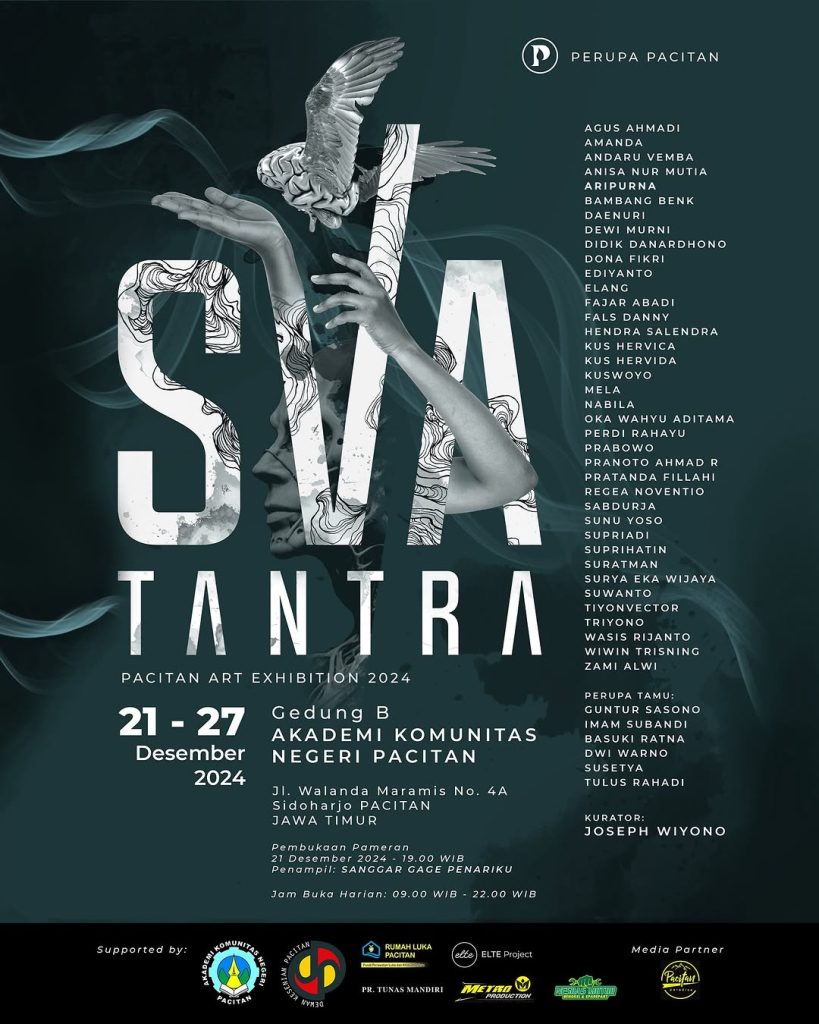 “SVATANTRA” Pacitan Art Exhibitions”Agenda / By charisma / December 23, 2024 Nikmati akhir tahun dengan menyaksikan “SVATANTRA” Pacitan Art Exhibitions. Dengan berbagai karya-karya spektakuler dari 44 perupa yang lolos kurasi.21-27 Desember 2024Gedung B Kampus AKN Pacitan Please follow and like us: