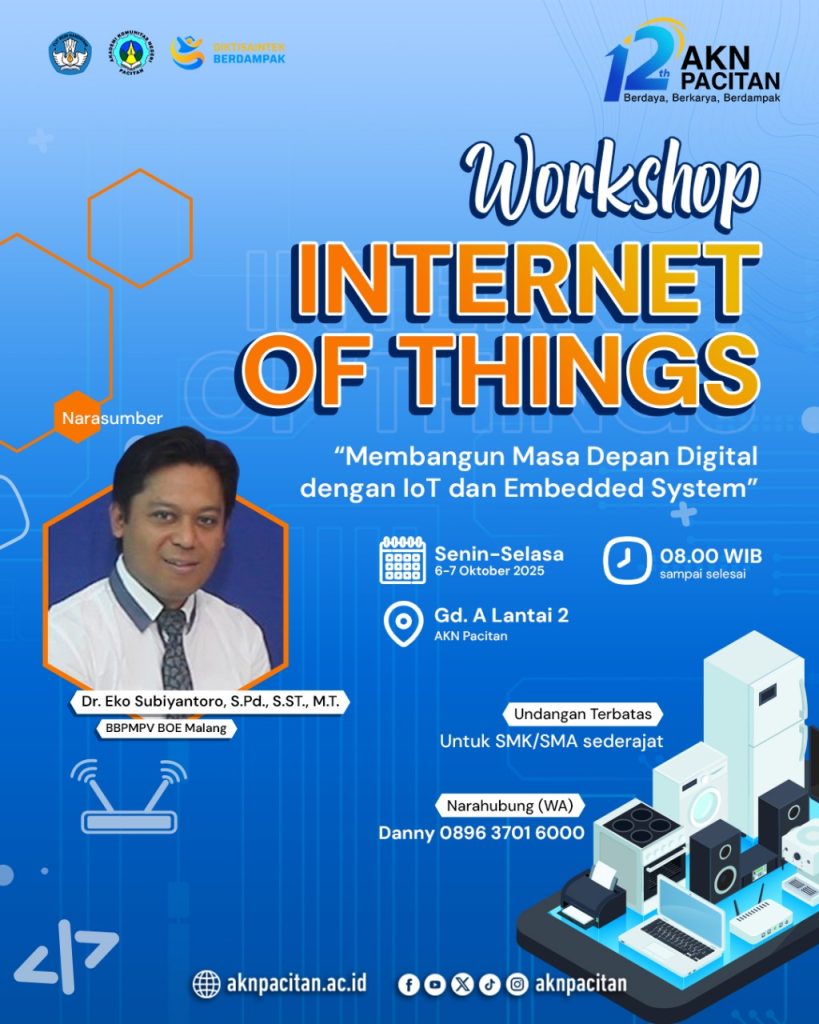 Pacitan, 5 Oktober 2025 — Dalam rangka memperingati Dies Natalis ke-12, Program Studi Pemeliharaan Komputer dan Jaringan (PKJ) Akademi Komunitas Negeri (AKN) Pacitan menyelenggarakan Workshop Internet of Things (IoT) bertema “Membangun Masa Depan Digital melalui IoT dan Embedded System.” Kegiatan yang berlangsung pada 6–7 Oktober 2025 di Gedung A Ruang Pertemuan AKN Pacitan ini bertujuan memperkuat literasi digital serta memperkenalkan penerapan teknologi cerdas kepada generasi muda di Kabupaten Pacitan.