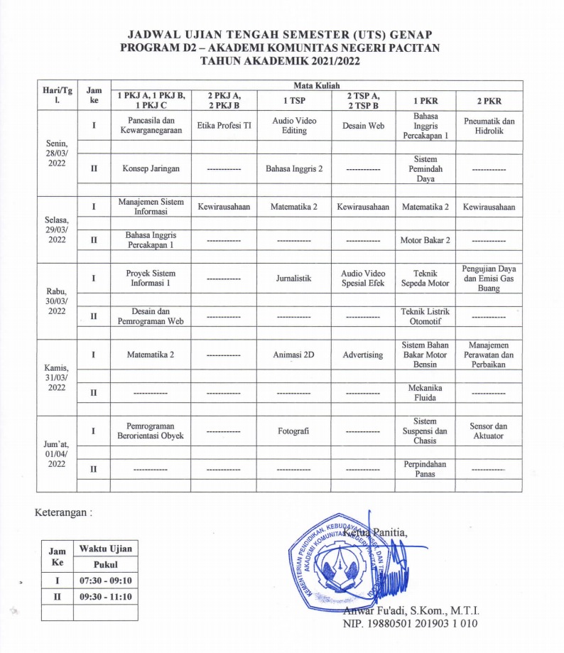 JADWAL UJIAN AKHIR SEMESTER (UAS) GENAP – PROGRAM D2 – AKEDEMI KOMUNITAS NEGERI PACITAN – TAHUN AKADEMIK 2021/2022, DAN TATA TERTIB PELAKSANAAN UAS