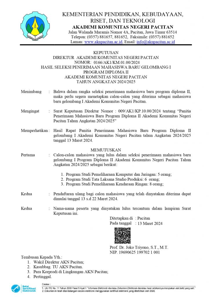 HASIL SELEKSI PENERIMAAN MAHASISWA BARU GELOMBANG I PROGRAM DIPLOMA II AKADEMI KOMUNITAS NEGERI PACITAN TAHUN AKADEMIK 2024/2025Pengumuman / By charisma / May 14, 2024 HASIL SELEKSI PENERIMAAN MAHASISWA BARU GELOMBANG IPROGRAM DIPLOMA IIAKADEMI KOMUNITAS NEGERI PACITANTAHUN AKADEMIK 2024/2025 Please follow and like us: