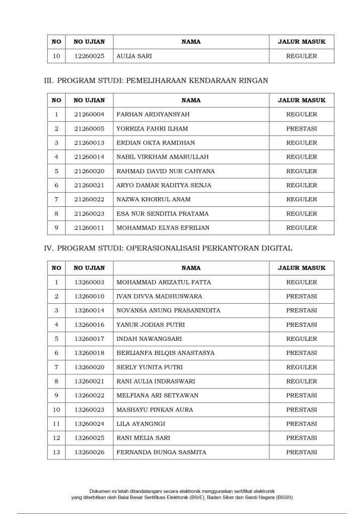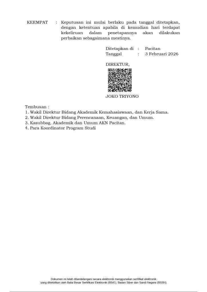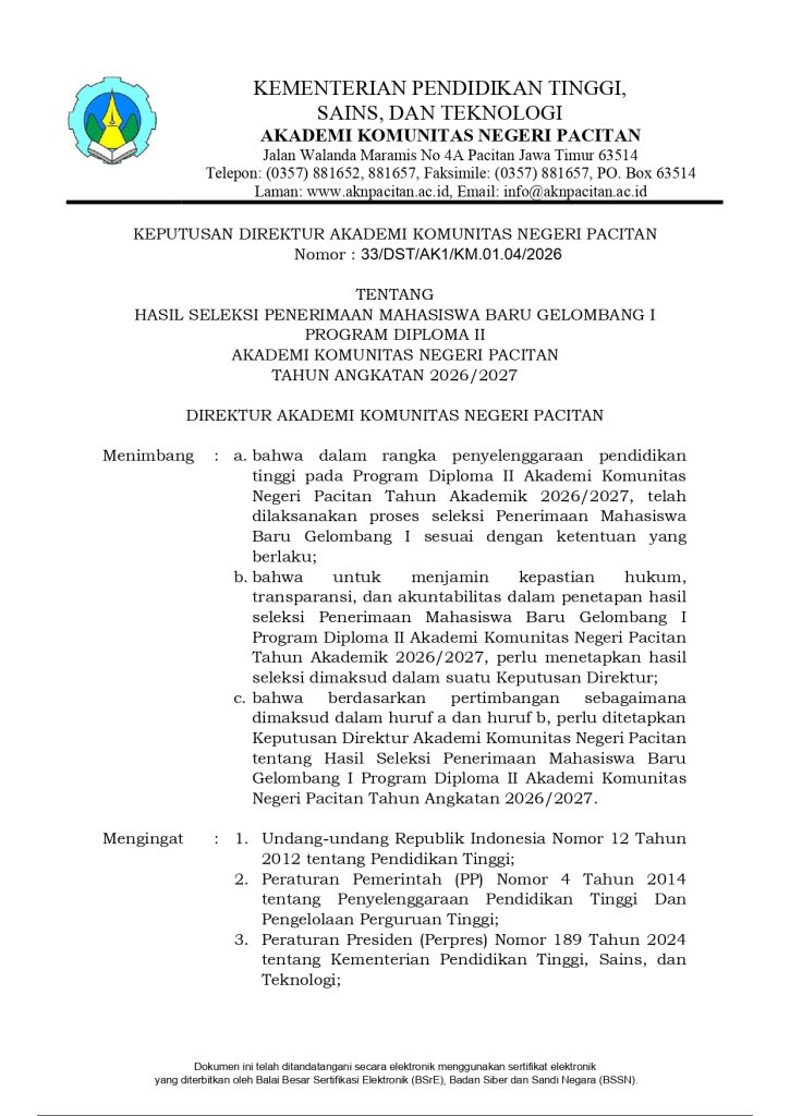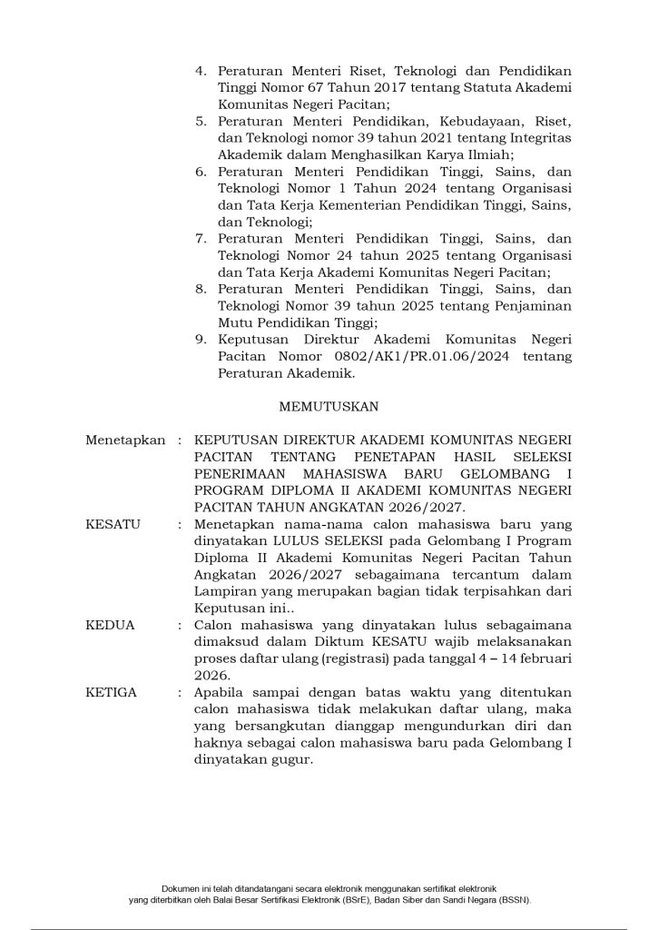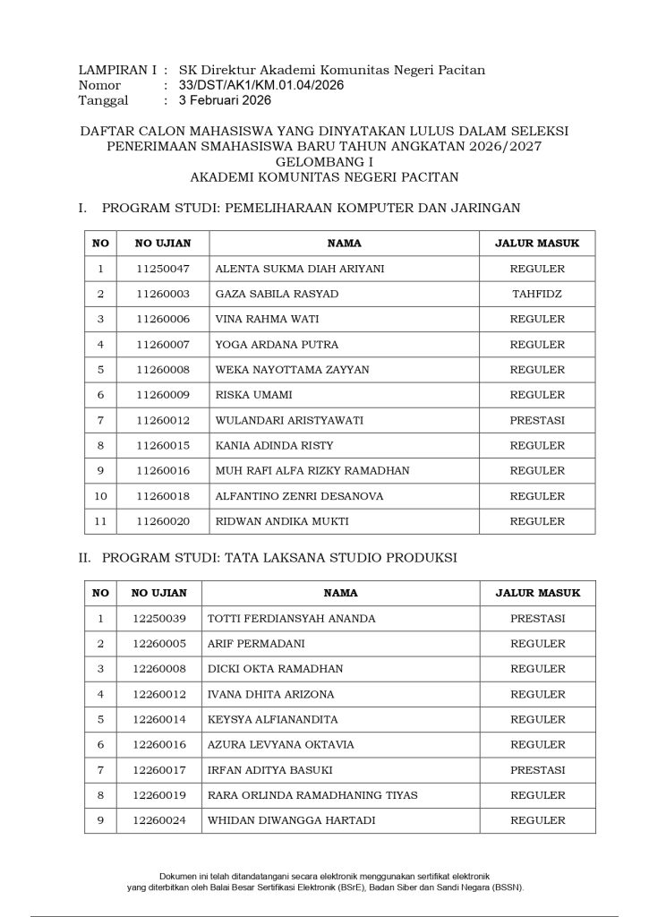 HASIL SELEKSI PENERIMAAN MAHASISWA BARU GELOMBANG I PROGRAM DIPLOMA II AKADEMI KOMUNITAS NEGERI PACITAN TAHUN ANGKATAN 2026/2027Pengumuman / By charisma / February 4, 2026 HASIL SELEKSI PENERIMAAN MAHASISWA BARU GELOMBANG IPROGRAM DIPLOMA IIAKADEMI KOMUNITAS NEGERI PACITANTAHUN ANGKATAN 2026/2027 Please follow and like us: