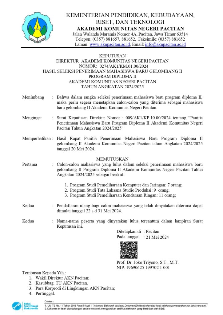 HASIL SELEKSI PENERIMAAN MAHASISWA BARU GELOMBANG II PROGRAM DIPLOMA II AKADEMI KOMUNITAS NEGERI PACITAN TAHUN AKADEMIK 2024/2025Pengumuman / By charisma / May 22, 2024 HASIL SELEKSI PENERIMAAN MAHASISWA BARU GELOMBANG II PROGRAM DIPLOMA II AKADEMI KOMUNITAS NEGERI PACITAN TAHUN AKADEMIK 2024/2025 Please follow and like us: