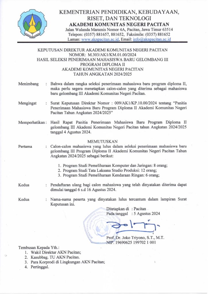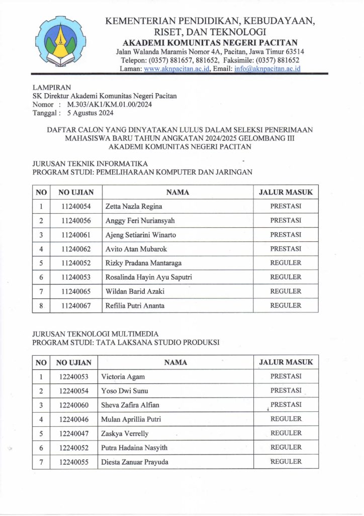 HASIL SELEKSI PENERIMAAN MAHASISWA BARU GELOMBANG III PROGRAM DIPLOMA II AKADEMI KOMUNITAS NEGERI PACITAN TAHUN AKADEMIK 2024/2025Pengumuman / By charisma / August 5, 2024 HASIL SELEKSI PENERIMAAN MAHASISWA BARU GELOMBANG III PROGRAM DIPLOMA II AKADEMI KOMUNITAS NEGERI PACITAN TAHUN AKADEMIK 2024/2025 Please follow and like us: