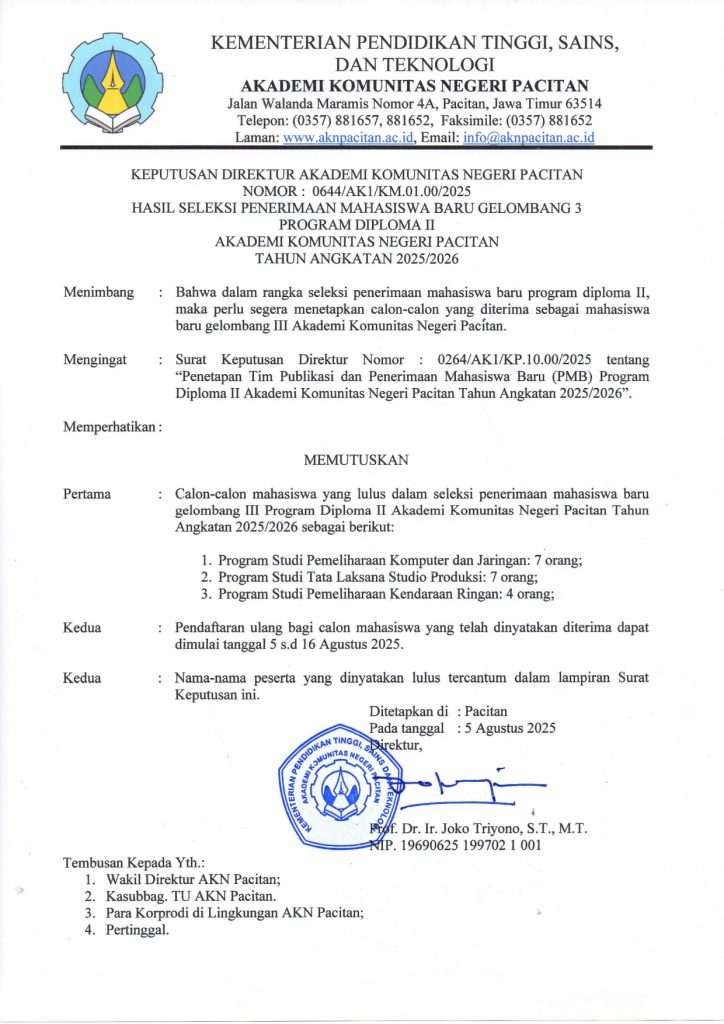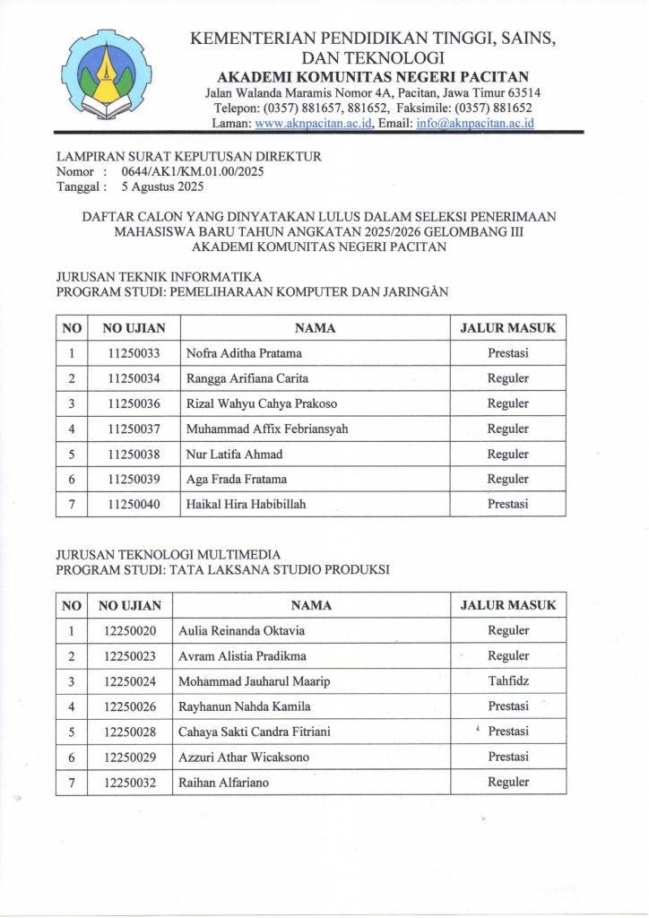 HASIL SELEKSI PENERIMAAN MAHASISWA BARU GELOMBANG III PROGRAM DIPLOMA II AKADEMI KOMUNITAS NEGERI PACITAN TAHUN ANGKATAN 2025/2026