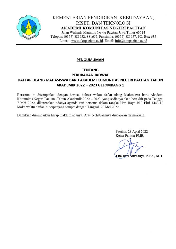 PENGUNDURAN JADWAL DAFTAR ULANG PMB GEL 1 2022Pengumuman / By charisma / April 28, 2022 SURAT PENGUNDURAN JADWAL DAFTAR ULANG PMB GEL 1 2022 Please follow and like us: